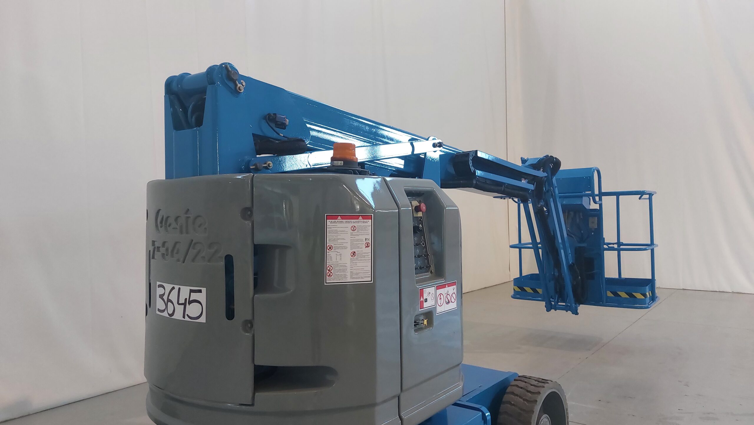 Electric articulated boom lift with a working height of 12.52m. Ideal for industrial environments and access to narrow aisles. With non-marking tires.