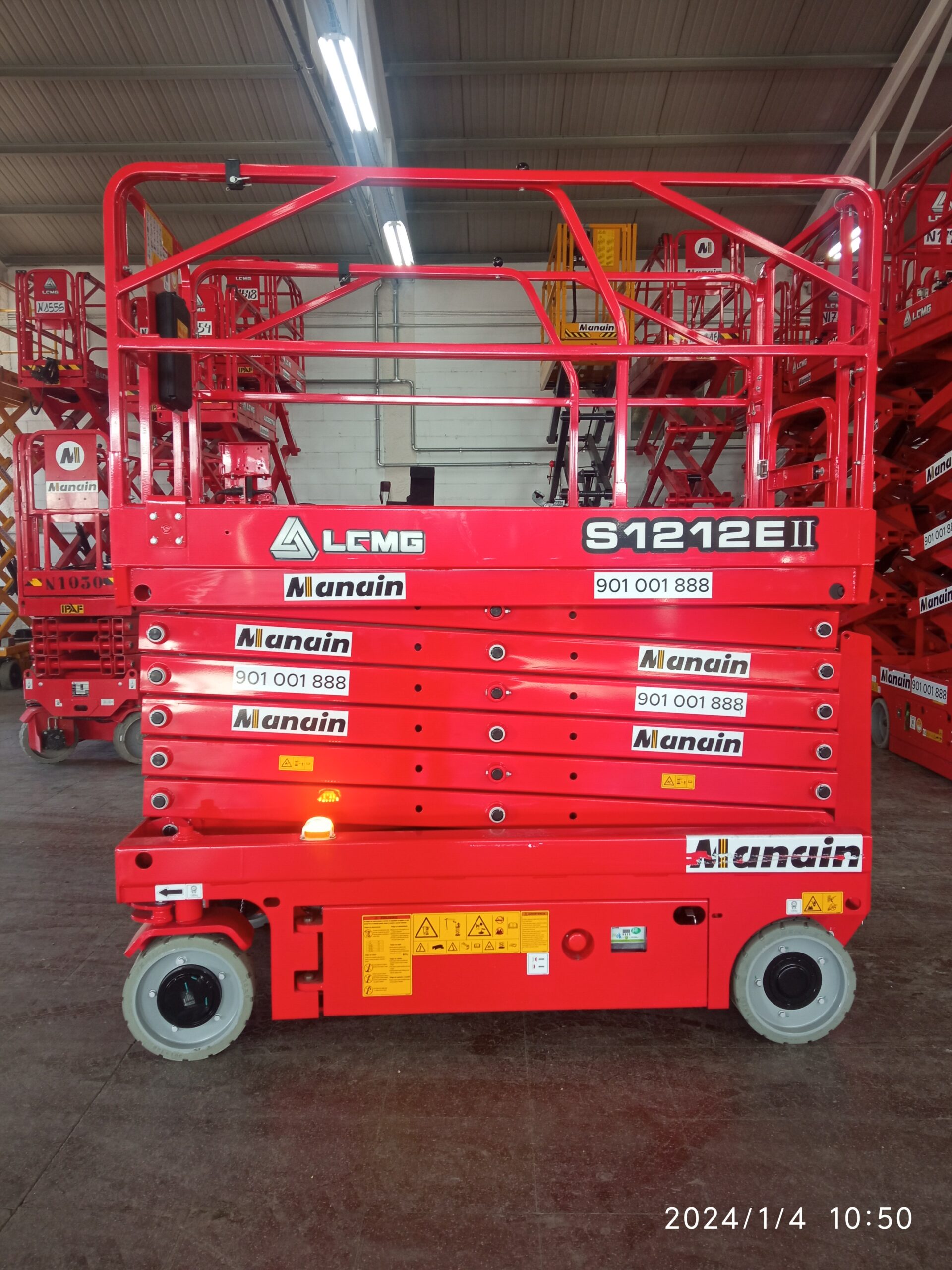 Electric scissor lift with a working height of 14m. Easy maneuverability and access indoors. Batteries with extended duty cycle.