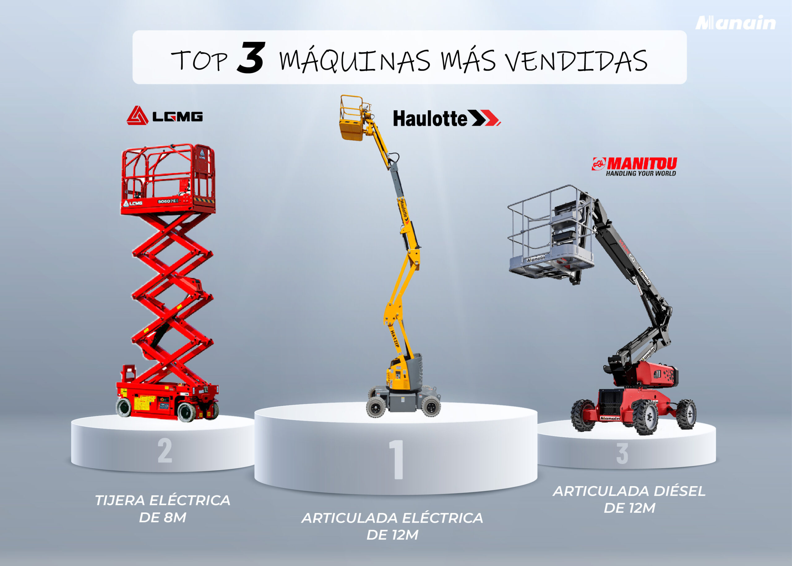 We finished 2023 and recap. As usual, we like to take stock and want to share some of the most notable figures in the rental and sale of lifting and construction machinery this year. Therefore, we have prepared a ranking of machines with the TOP 3 most sold and rented platforms by our customers, those models that have been rented the most and have been seen less in our Amposta, La Canonja, and Esparraguera facilities. And another TOP 3 compiling the most sold lift platform model throughout the year.