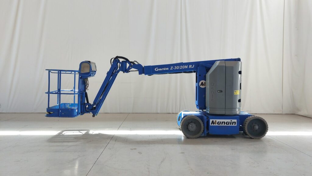 Plataforma de brazo articulado eléctrico de 11m de altura de trabajo. Rotación horizontal del plumín. Acceso a interiores a través de puertas estándar. Con neumáticos que no dejan marca.