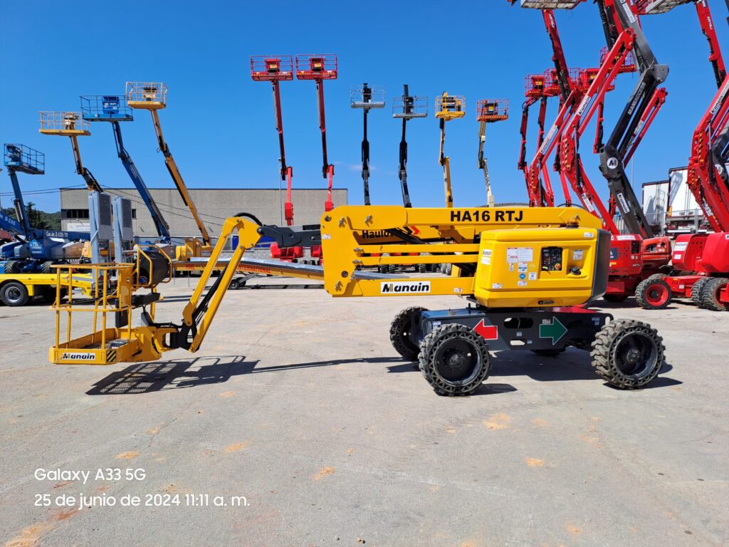 Plataforma de brazo articulado diésel de 16m de altura de trabajo. Diseño todoterreno que permite circular por terrenos irregulares y embarrados. Rotación de torreta de 360º.